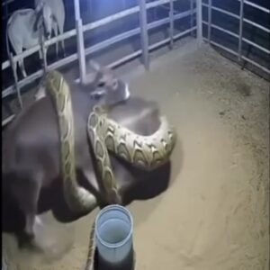 A terrifying scene was captured on farm security footage when a giant python appeared to coil itself around a cow inside a fenced shelter late at night….