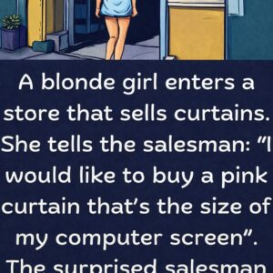 A blonde woman walks into a store that sells curtains and approaches the salesman with confidence. She explains that she would like to buy a pink curtain…