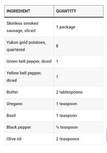 In a large oven-safe pan or baking dish, spread the sliced sausage, quartered potatoes, and diced peppers evenly in a single layer.