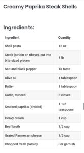 How To Make Creamy Paprika Steak Shells:Step 1: Cook Pasta: Cook the 12 oz shell pasta in a large pot of salted water according to package directions until al dente. Drain and set aside.Step 2: Season Steak: Meanwhile, season the 1 lb steak pieces generously with salt, pepper, and 1 teaspoon of the smoked paprika, tossing to coat evenly.Step 3: Sear Steak: Heat the 1 tablespoon olive oil in a large skillet set over medium-high heat. Once hot, add the steak bites and sear for 2-3 minutes per side, until deeply browned but still tender inside. Remove the steak to a plate and set aside.Step 4: Sauté Garlic and Paprika: Reduce the heat to medium and add the 1 tablespoon butter to the same skillet. Once melted, add the 3 cloves minced garlic and sauté for about 1 minute, just until fragrant. Stir in the remaining 1/2 teaspoon smoked paprika.Step 5: Make the Sauce: Pour in the 1 cup heavy cream and 1/2 cup beef broth, stirring to combine and scraping up any browned bits left from the steak. Let the mixture come to a gentle simmer, and cook for 3-4 minutes until the sauce slightly thickens.Step 6: Add Cheese: Stir in the 1/2 cup grated Parmesan cheese until fully melted and the sauce is creamy and smooth.Step 7: Combine and Serve: Add the cooked pasta shells and steak pieces back to the skillet. Gently toss everything together until the pasta and steak are evenly coated in sauce. Remove from heat, sprinkle with chopped fresh parsley, and serve piping hot.